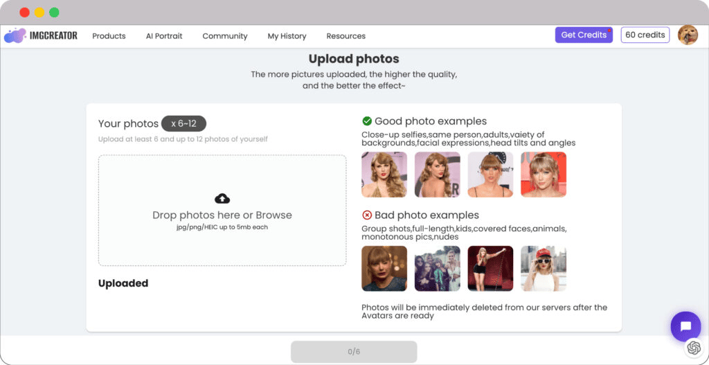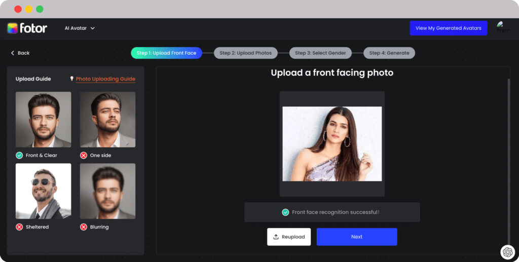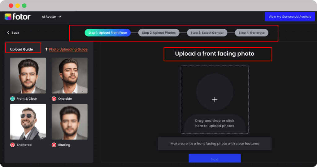 The image below shows the Fotor dashboard that gives you a photo-uploading guide to get a better-quality avatar.