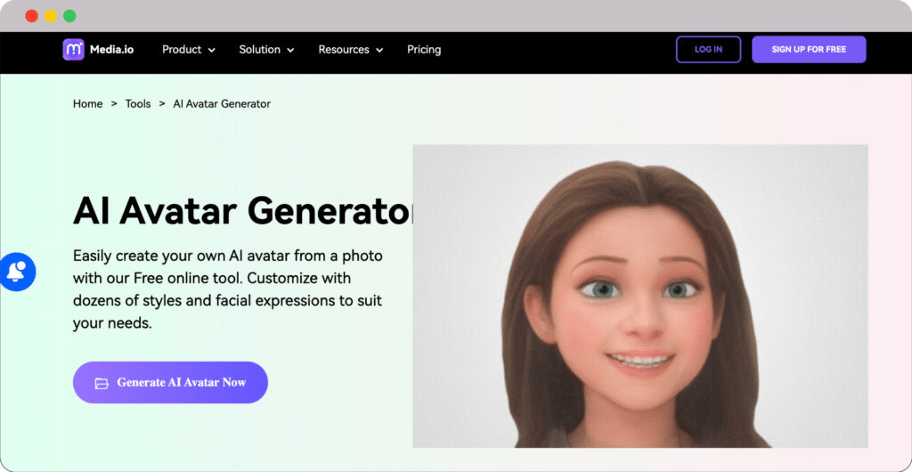 Media.io is an innovative AI Avatar Generator. It lets you create your avatar effortlessly using its free version. The platform gives you a diverse array of styles and facial expressions to choose from. The tool lets you customize your avatar to match your unique identity.