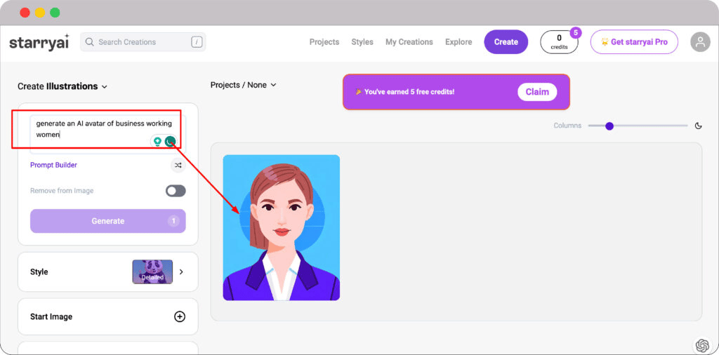 The Starryai avatar generator’s dashboard view is shown in the image below. You have to give a prompt on the left side of the screen to get the result on the right side.