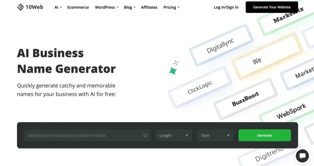 If you’re looking for an advanced AI business name generator that can quickly generate memorable and engaging names for your brand, then 10Web is made just for you.