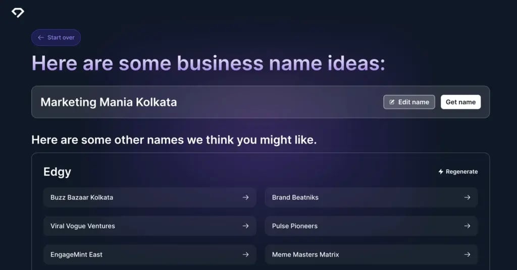 If you don’t like the AI-generated business names and need a name with more relevance, click on the “Get Company Names” option, and it will create ten more business name ideas instantly.