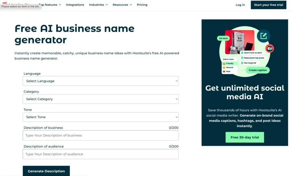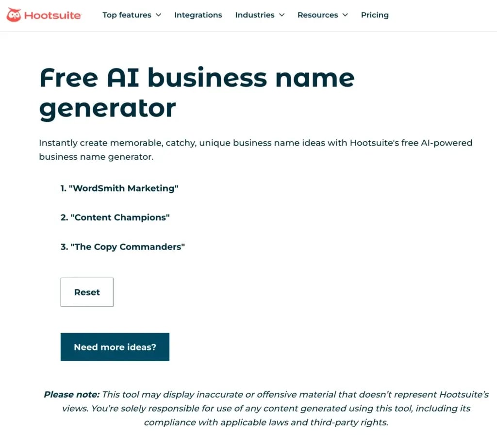Ending my AI business name generator list with Hootsuite, a free tool that can create memorable, catchy, and unique business names instantly.