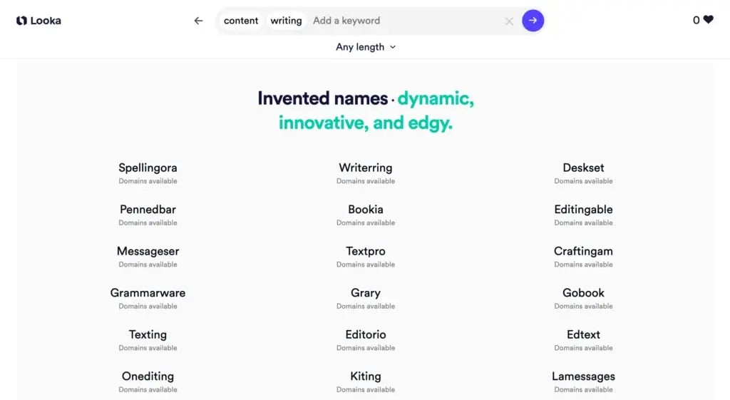 Depending on your requirements, Looka will generate names in four different categories: Invented names, Traditional names, Multi-word names, and Compound names.