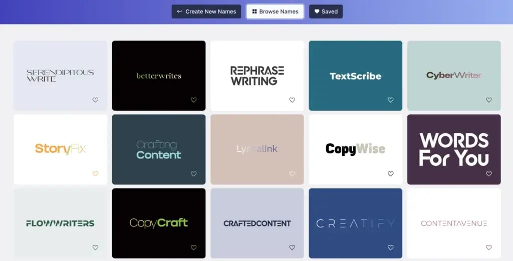 Not only does BrandCrowd generate business names, but it also suggests logo options, something you will rarely find in any other AI company name generator.
