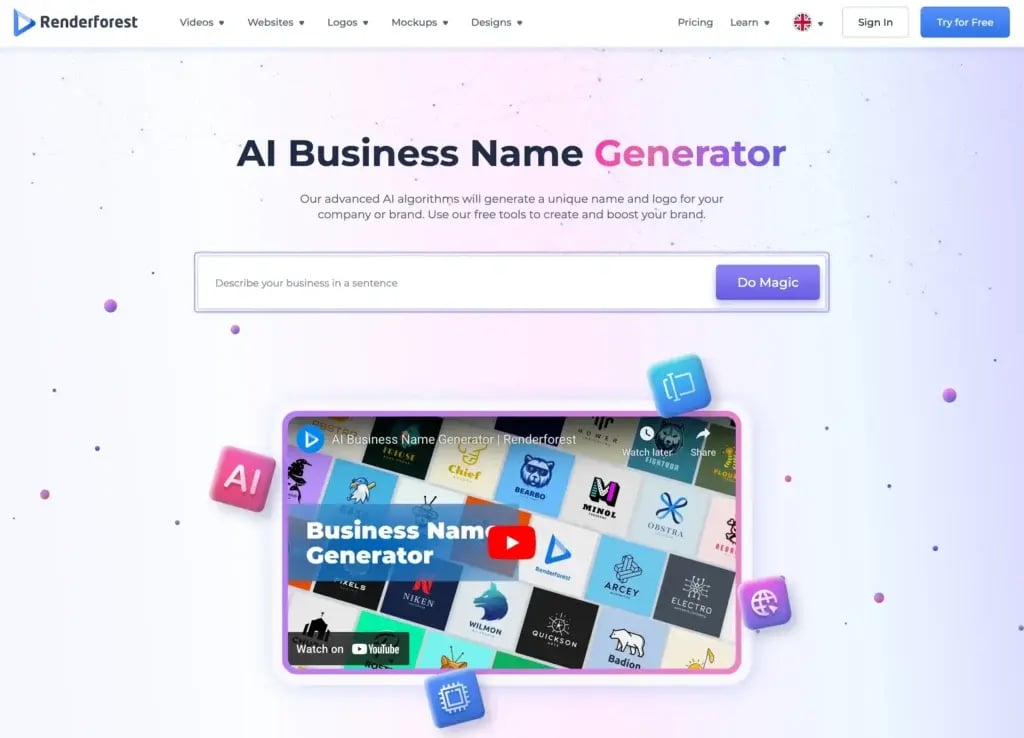 The Renderforest business name generator is a free online tool that helps you brainstorm and find the perfect name for your new brand. It combines advanced AI to suggest creative and relevant business names in seconds.