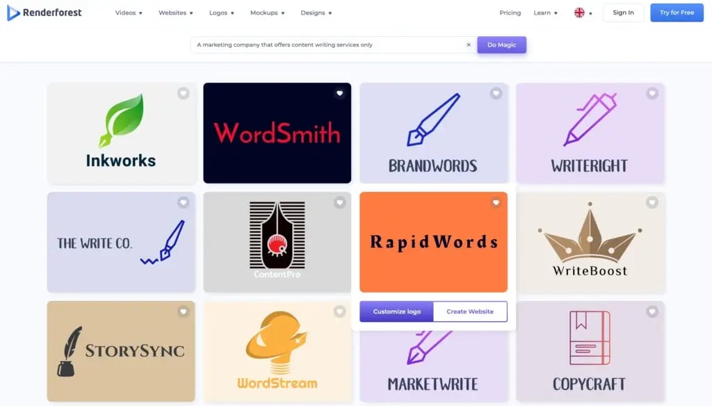 While many other AI business name generator tools use AI and ML algorithms, Renderforest took this game a little far.