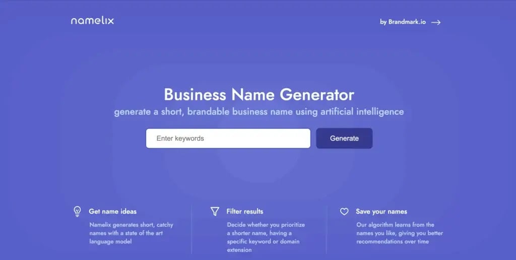 Below, I have listed the most effective AI business name generator tools. While the perfect one that that helps you find the perfect name depends on the provided keywords, they come with unique features.