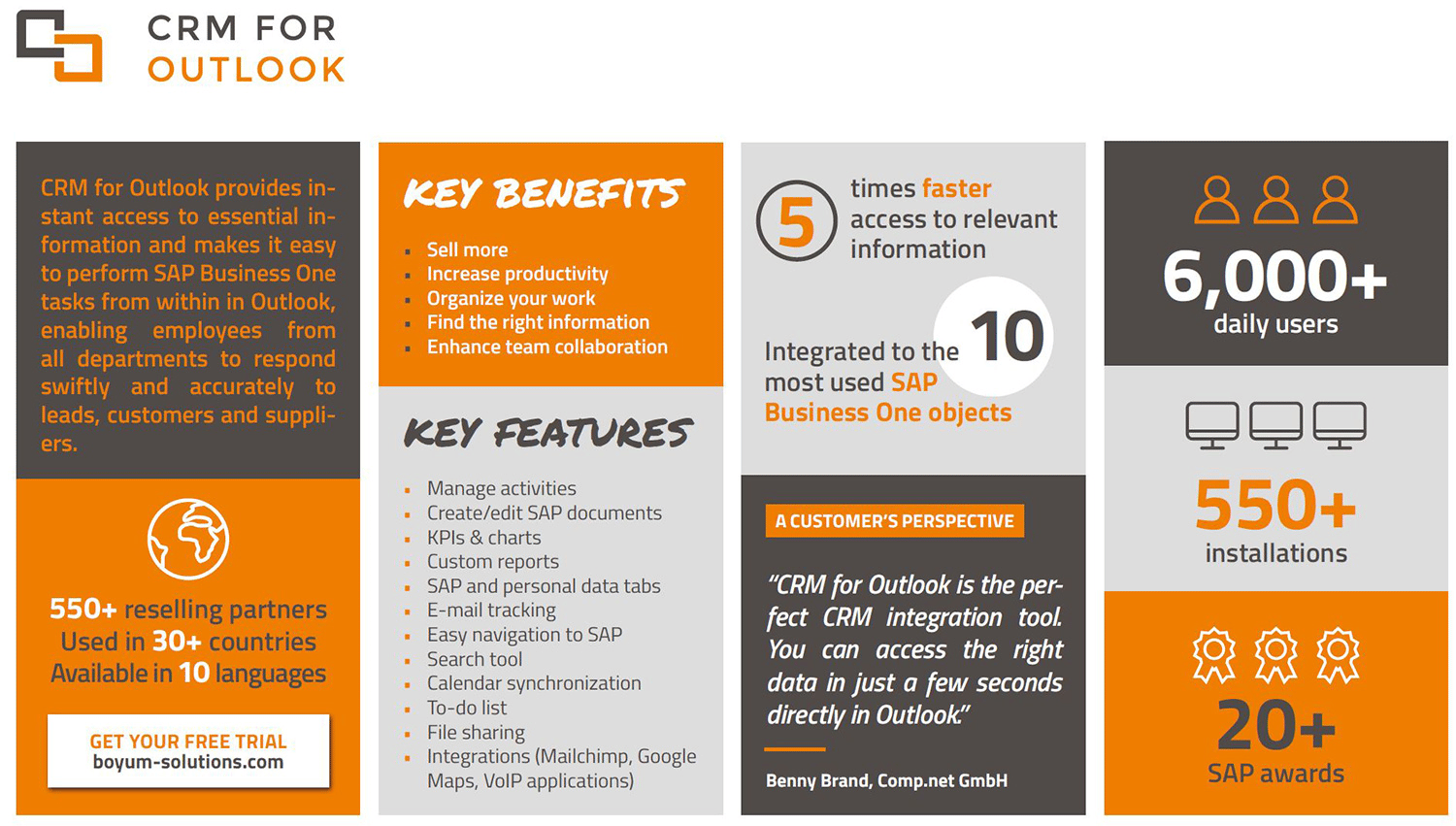 Nimble’s Outlook CRM integration helps you centralize and organize your contacts within Outlook. For sales teams who conduct a significant amount of work on social networking sites like LinkedIn, this is one of the best alternatives currently available on the market.