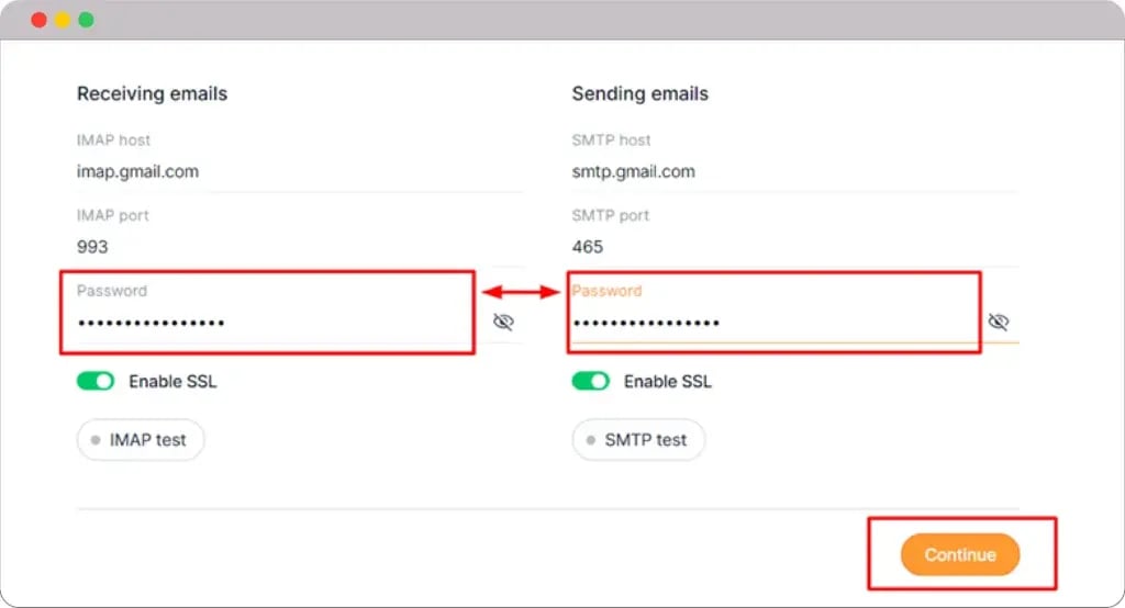 - Now, you must fill in your account credentials and enter your app password. You can also choose any other receiving email. But initially, you need to enable your IMAP and get your App password.