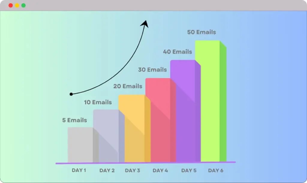 On the first day, you start by sending five emails. The next day, you can increase the number to 10 and then to 20 on a consecutive day. Continue this gradual increase until you reach 80-100 emails daily. Maintain this volume for at least two weeks before starting your email campaigns.