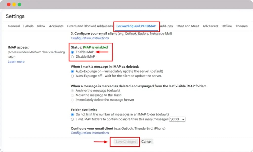 - Now go to “Forwarding and POP/IMAP” and scroll down. You will see the IMAP status. Click on “Enable IMAP” and hit “Save Changes.”