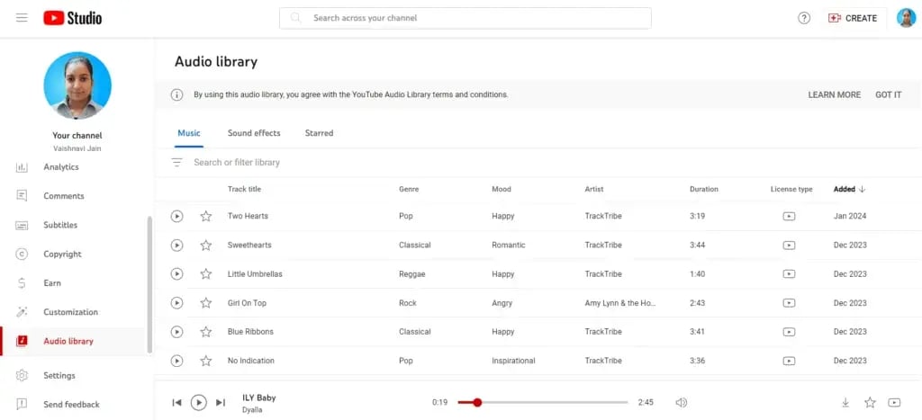Accessible through YouTube Studio, this library enhances creative content, even for monetized videos. The process is seamless – listen to the sample and, with a click, download the desired MP3 music.