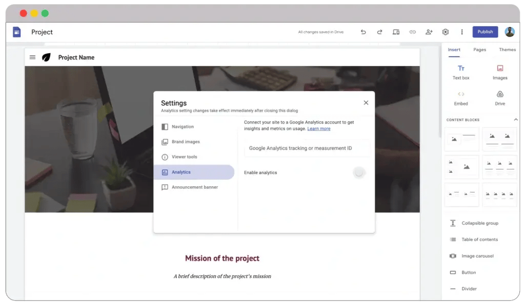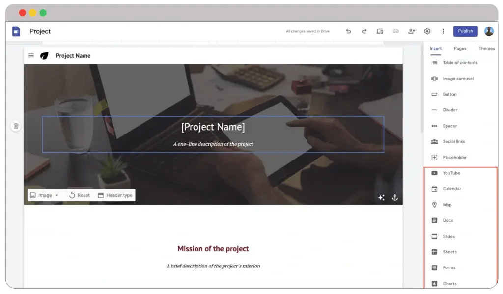 Google’s website editor is almost flawless. It lets you customize various aspects of your website to ensure you achieve the most preferred one. You can add texts, button layouts, images, etc. Moreover, you can also add Google tools like Docs, Sheets, Forms, etc.