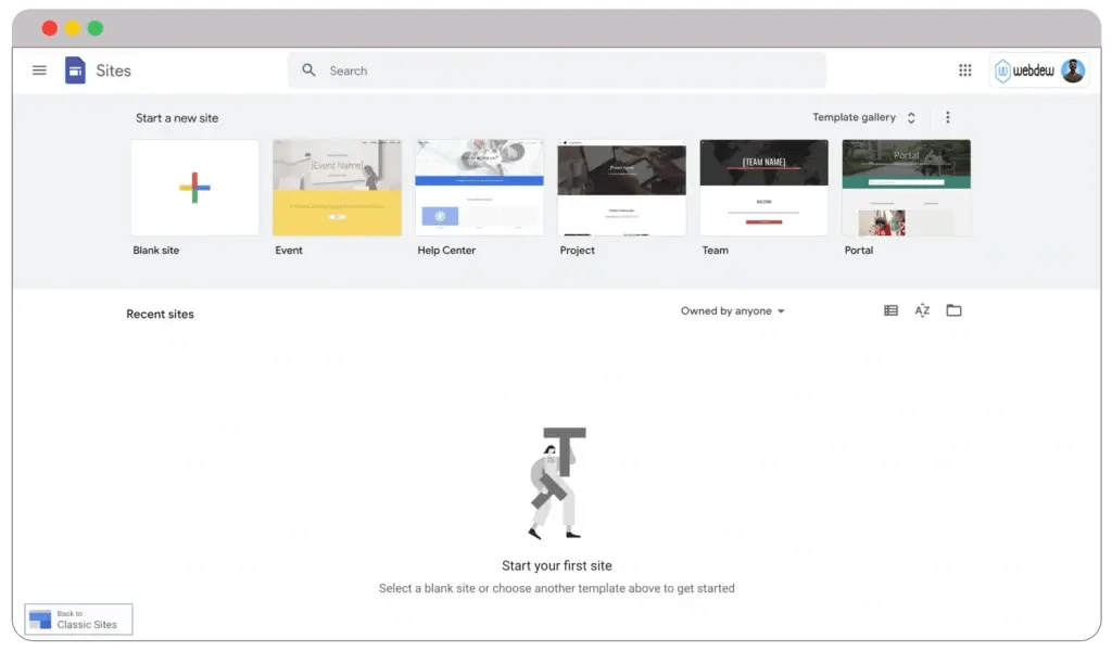 If you look at the below image, it’s the primary dashboard of Google website builder. Unlike most options, you don’t need to go through any time-consuming account creation process. You’re good to go as long as you’re signed in using your Google account.