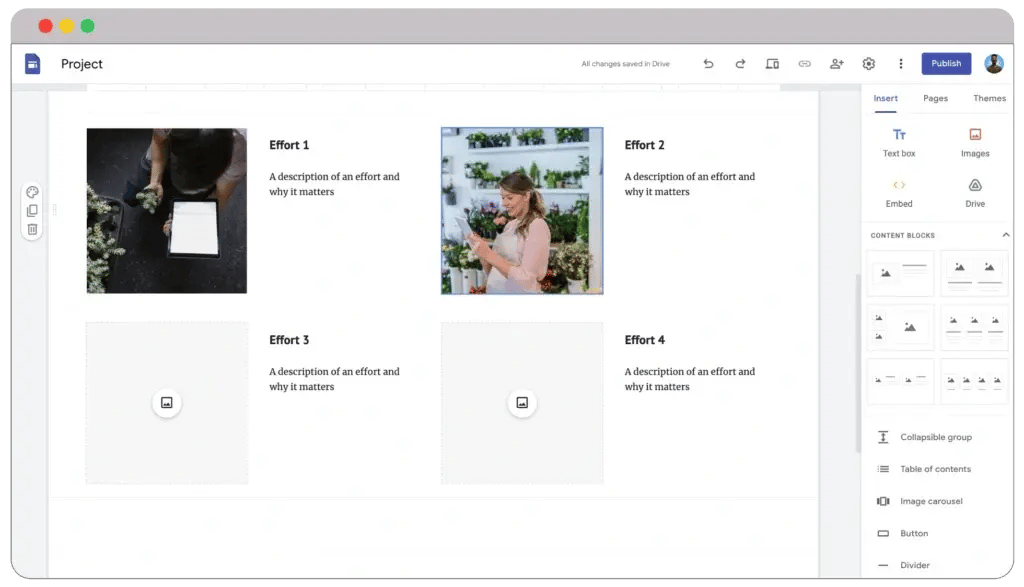 Google Sites provides a free plan and is also super simple to use. Even if you don’t have any website creation experience, you can still create an eye-catching website without any problems.