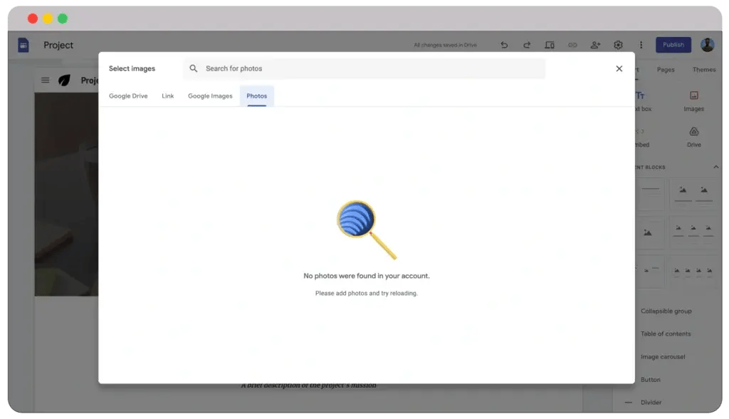 You will be disappointed when you want to upload an image when you use Google website builder. I’m not saying you cannot upload images. In fact, you can upload them straight from your internal system or Google Drive.