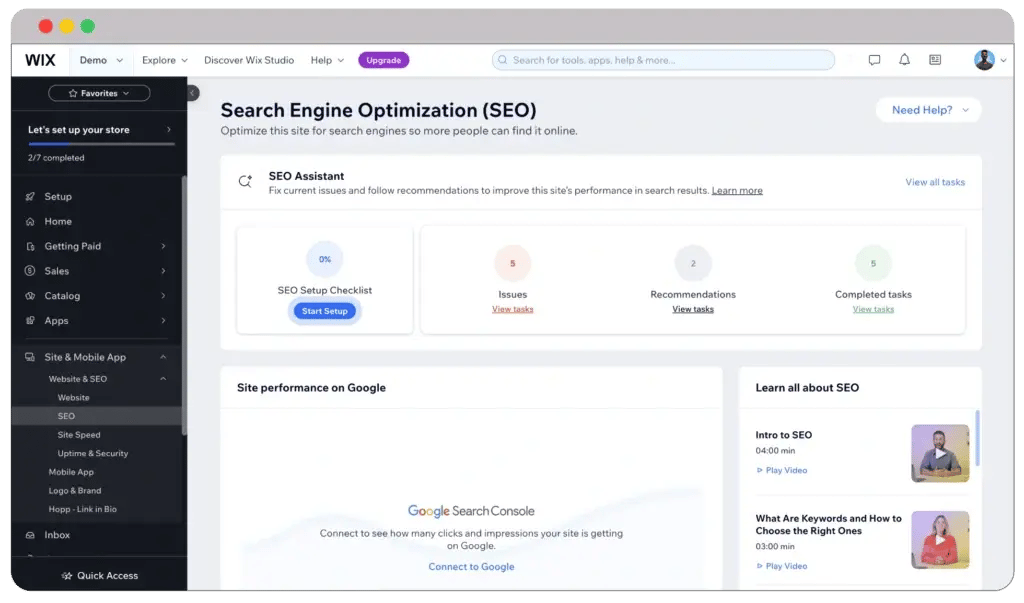 On the other hand, Wix gives you a dedicated dashboard to make your website more SEO-friendly. You can control different SEO aspects, from site inspection and sitemaps to site verification.