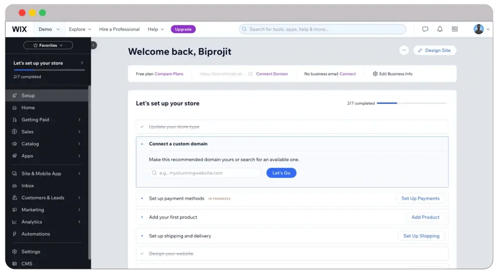 When you’re done with the setup option, you will be redirected to this dashboard. This is the primary dashboard from where you can control every aspect of your Wix website. All options are arranged on the left sidebar of the screen.