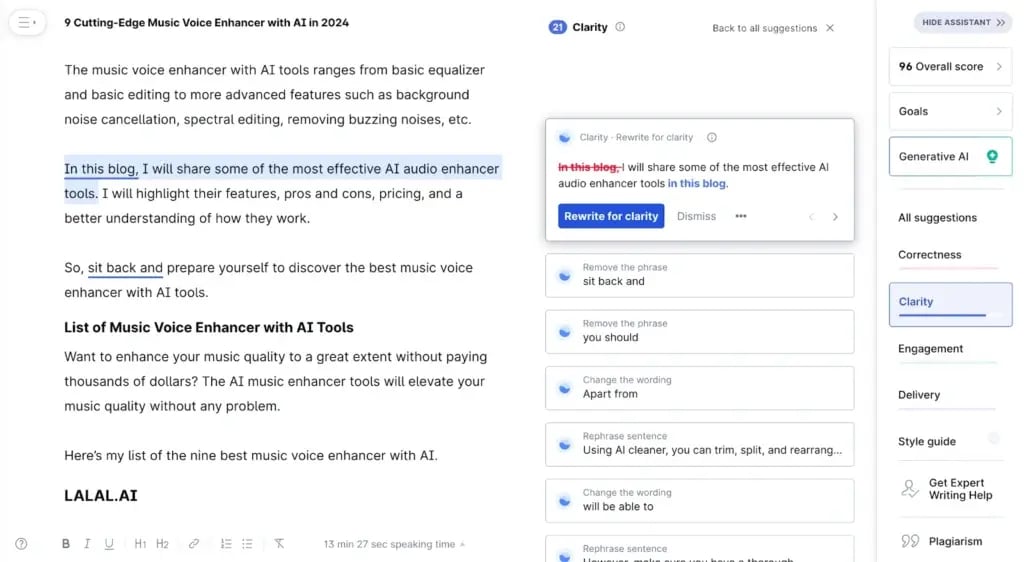 But things get a lot of exciting with the Premium version. The Premium plan’s Clarity tab will highlight wordy and complex sentences. It will automatically rewrite the sentences to make them more understandable.