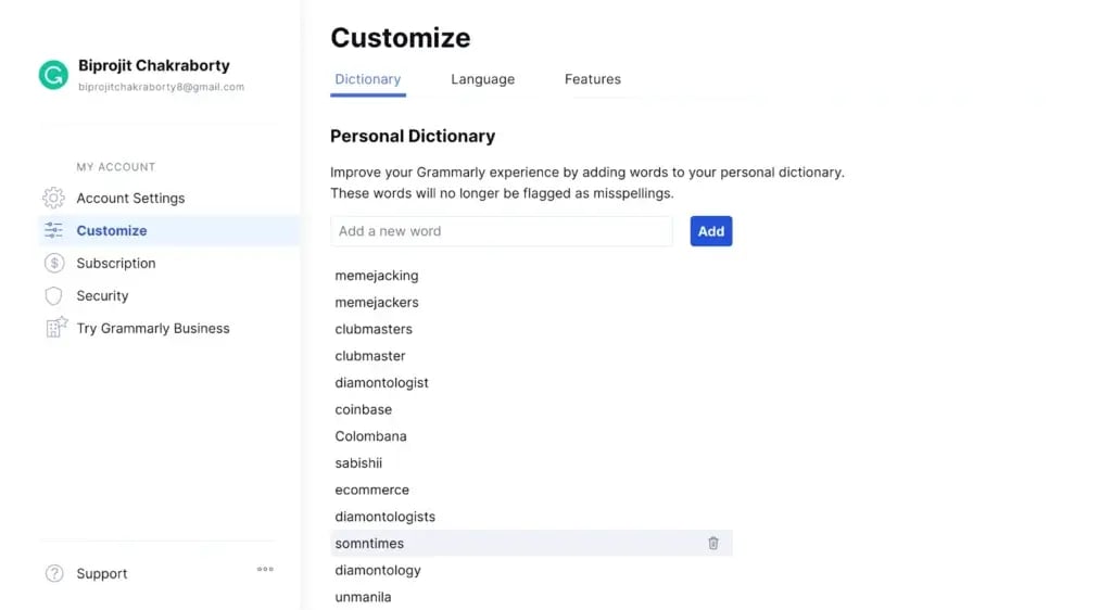 After adding such words to the dictionary, Grammarly will automatically accept them as correct words. From next time, they won’t be flagged within the doc.