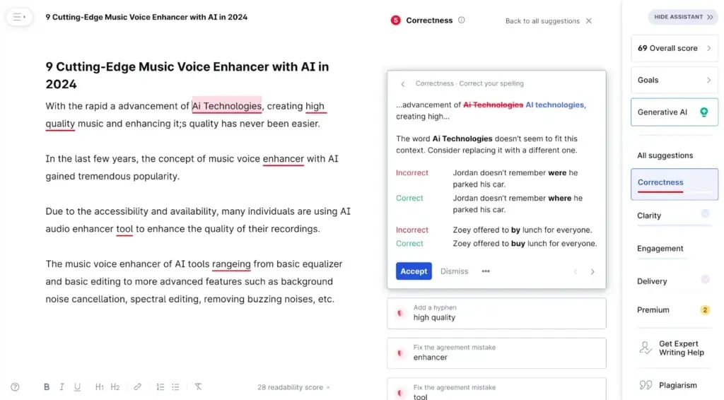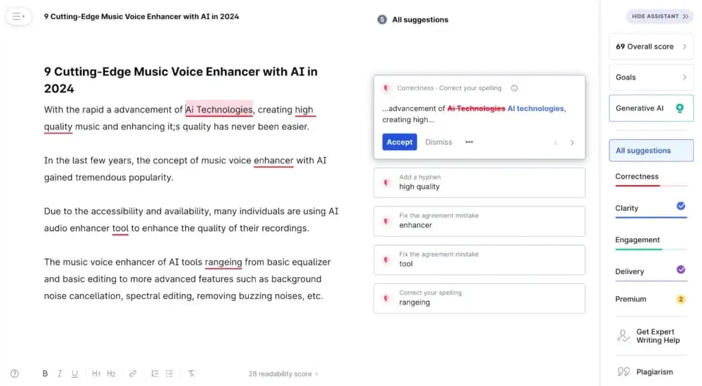 Grammarly will rate your content on a scale of 100 while representing your writing quality. The score will increase when you implement more suggestions.