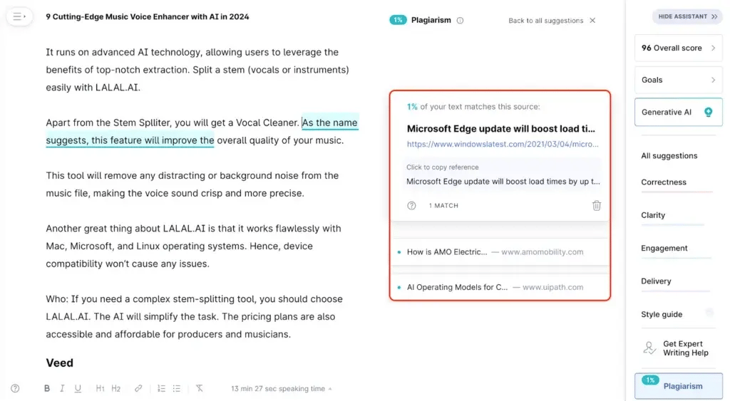 That being said, I must say that Grammarly’s plagiarism checker is quite average. I hope they work on this tool in the future.
