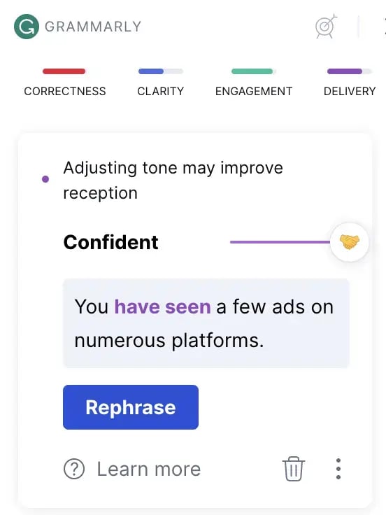 Here, Grammarly suggested that the tone can be more confident. However, some toning suggestions may seem vague. Make sure you choose carefully, or you will end up altering the whole sentence structure.