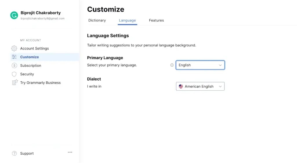With Grammarly, you can choose from four types of English – American, British, Canadian, and Australian. Depending on your location, you may find an additional English type.