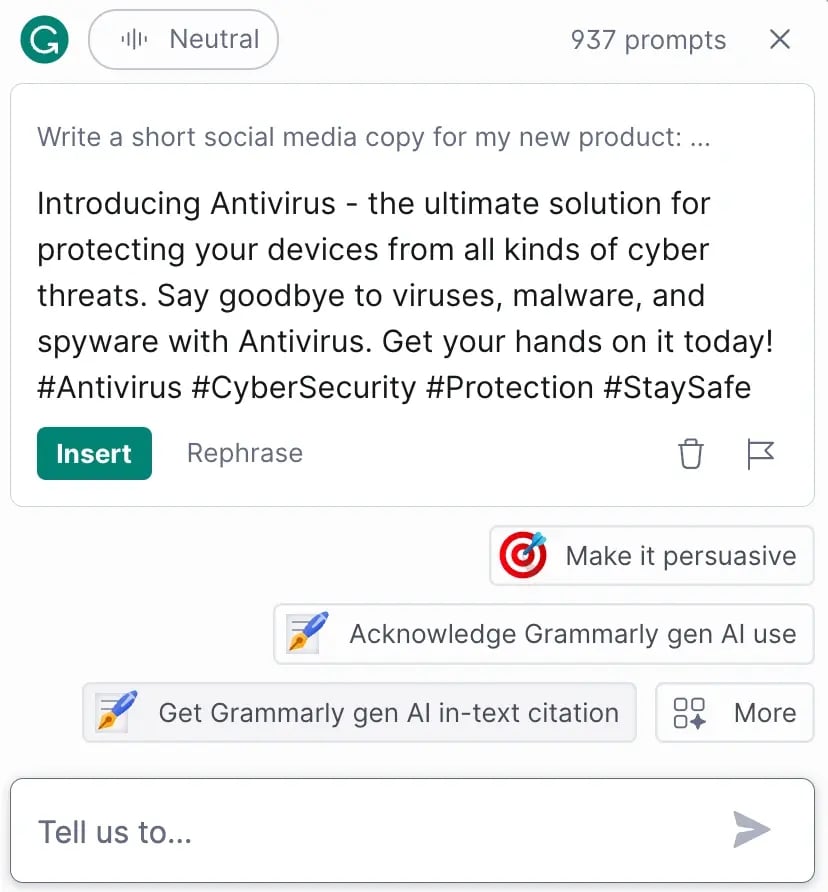 I was impressed when Grammarly followed my prompt and created a short social media copy. It took only a few seconds for Grammarly to come up with some unique results.
