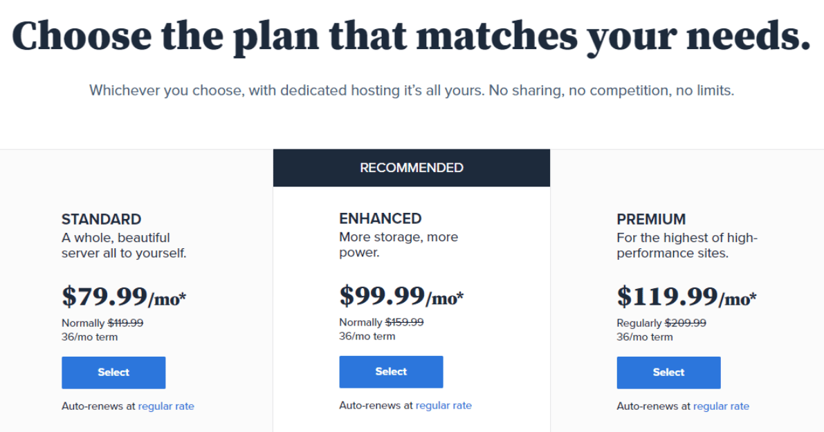 Dedicated hosting plans can be purchased for $79.99 to $505.99 per month. The renewal costs can vary from $119.99 to $749.99 per month.