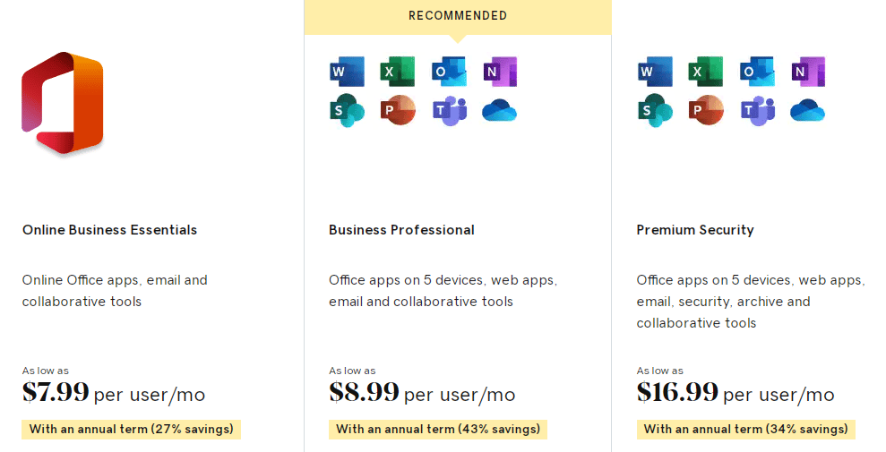 This upsell can cost you anywhere between $2.99 to $11.74 per user per month when you book a long-term Office 365 plan with a hosting provider. Here is the pricing of Office 365 plans offered by GoDaddy: