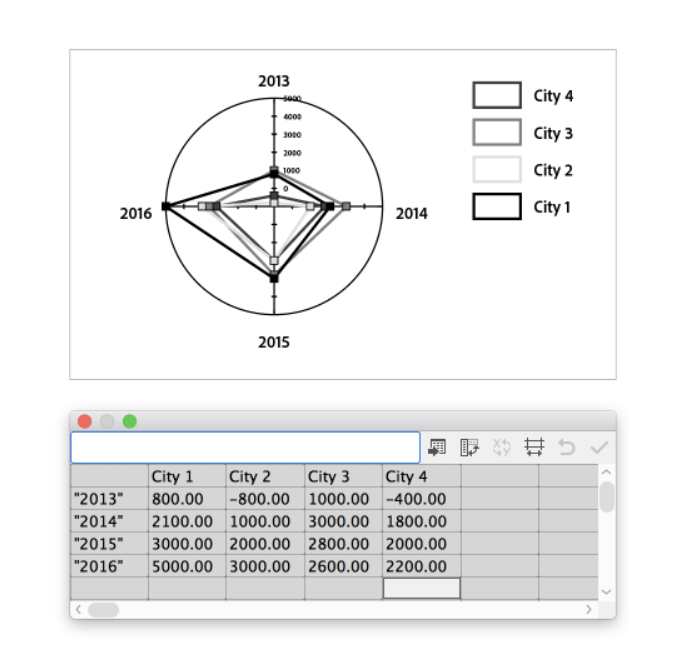 Each value is displayed on an axis and linked together to form a “web.” A radar graph can have positive and negative values.