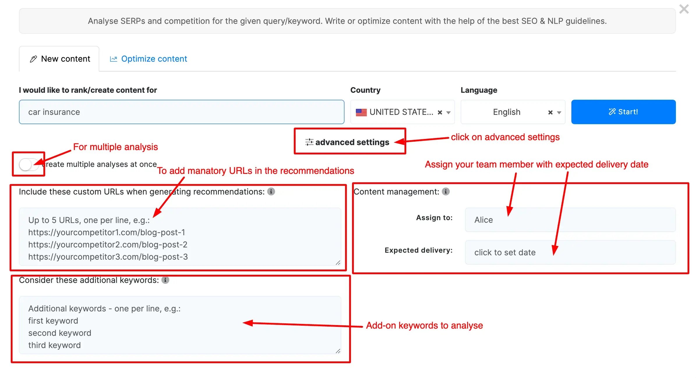 You can also use the multiple analysis option by toggling the given slider. Moreover, you can elaborate your analysis by adding some included URLs and add-on keywords to super-optimize the recommendations.