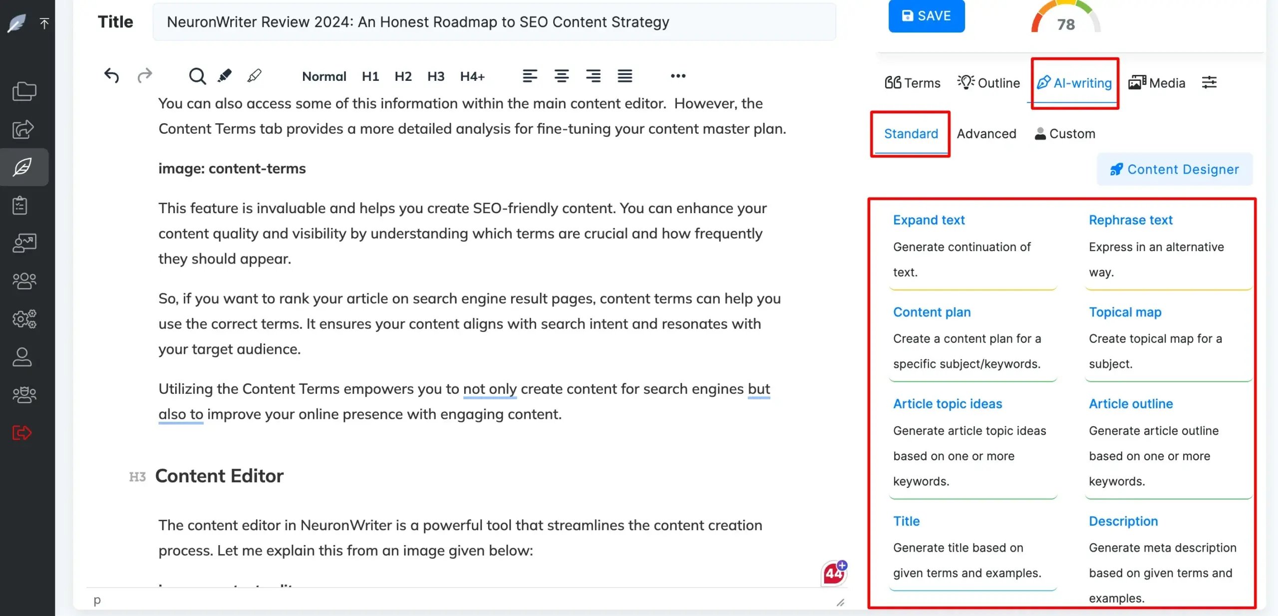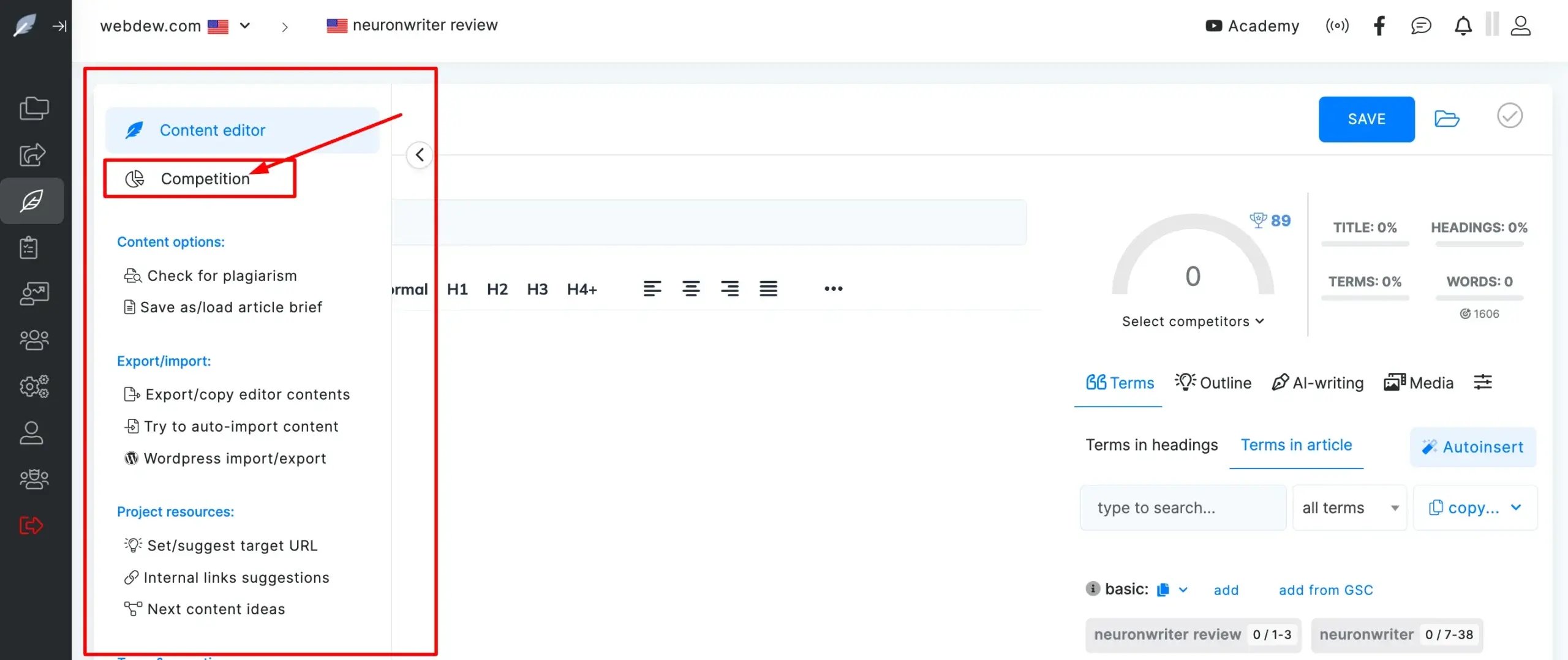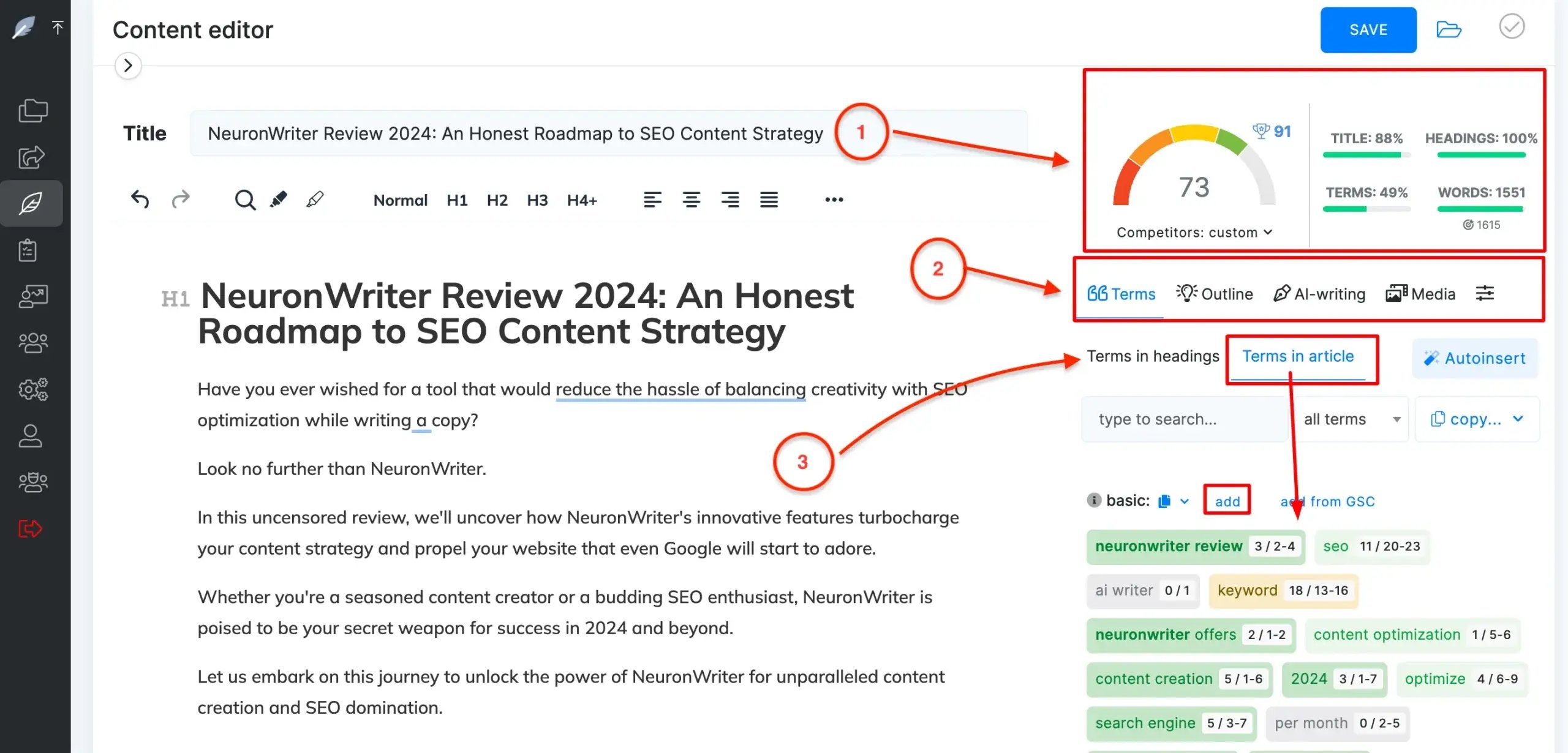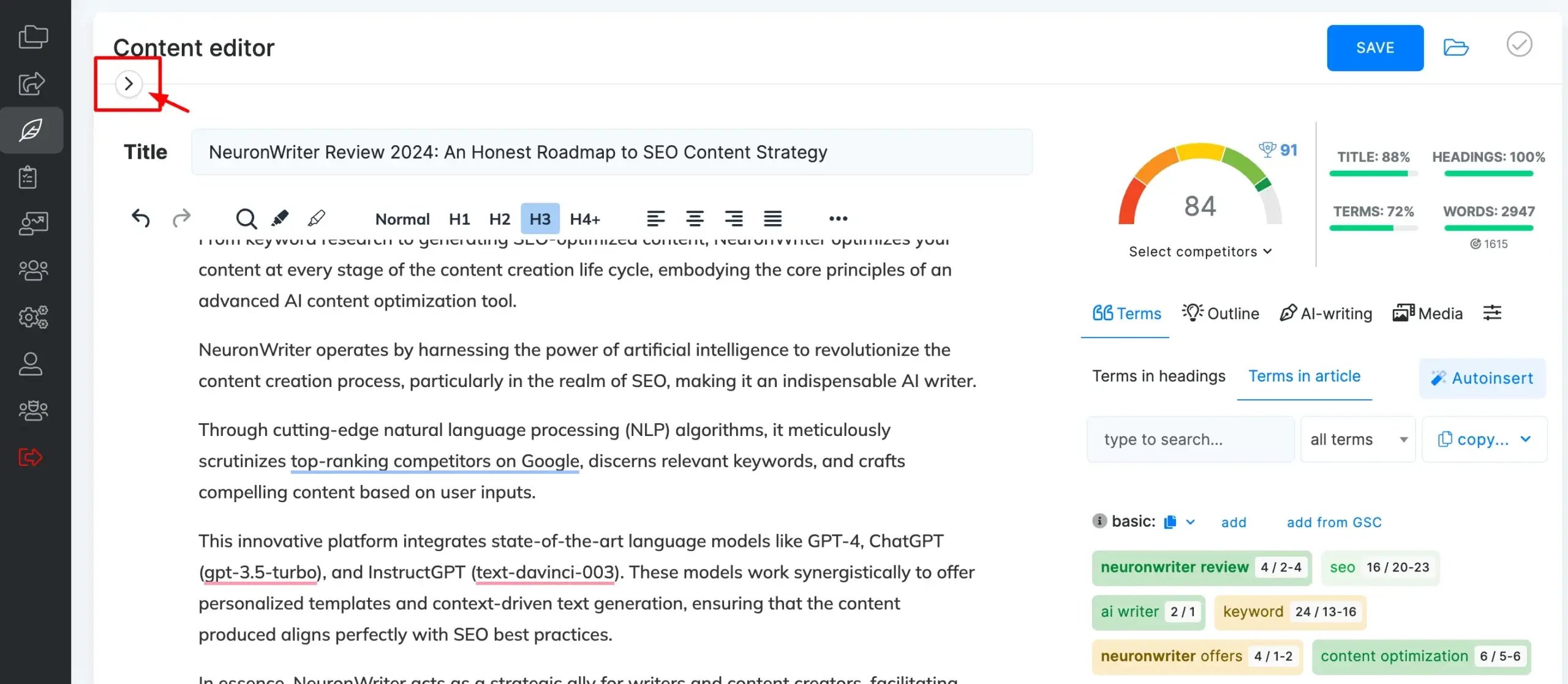 The content editor in NeuronWriter is a powerful tool that streamlines the content creation process. Let me explain this from an image given below: