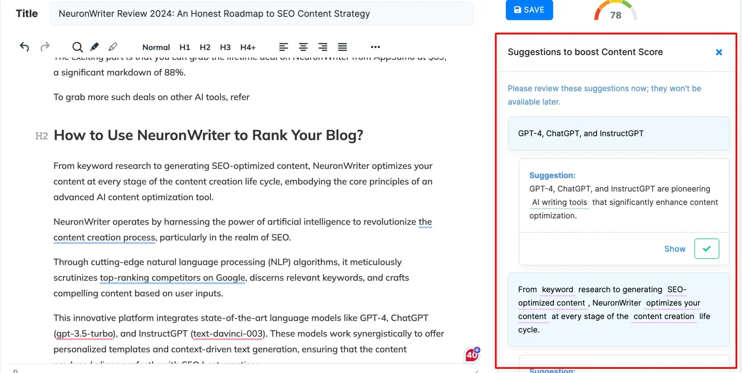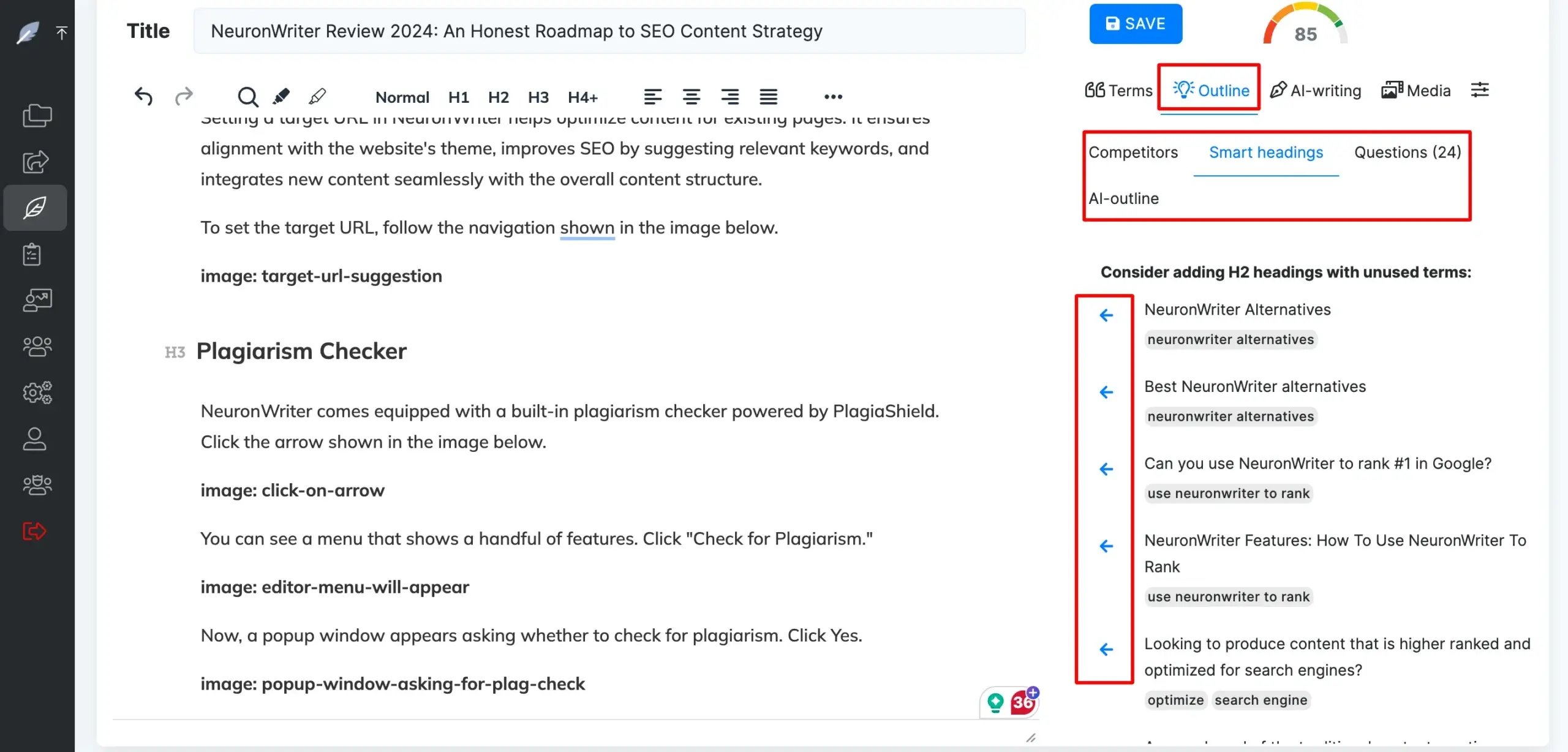 NeuronWriter offers a wide range of features tailored to writers and marketers. It helps you save time by offering guidance at every step of writing content.