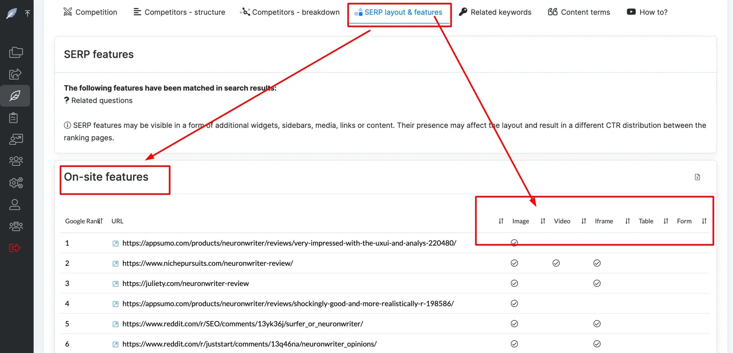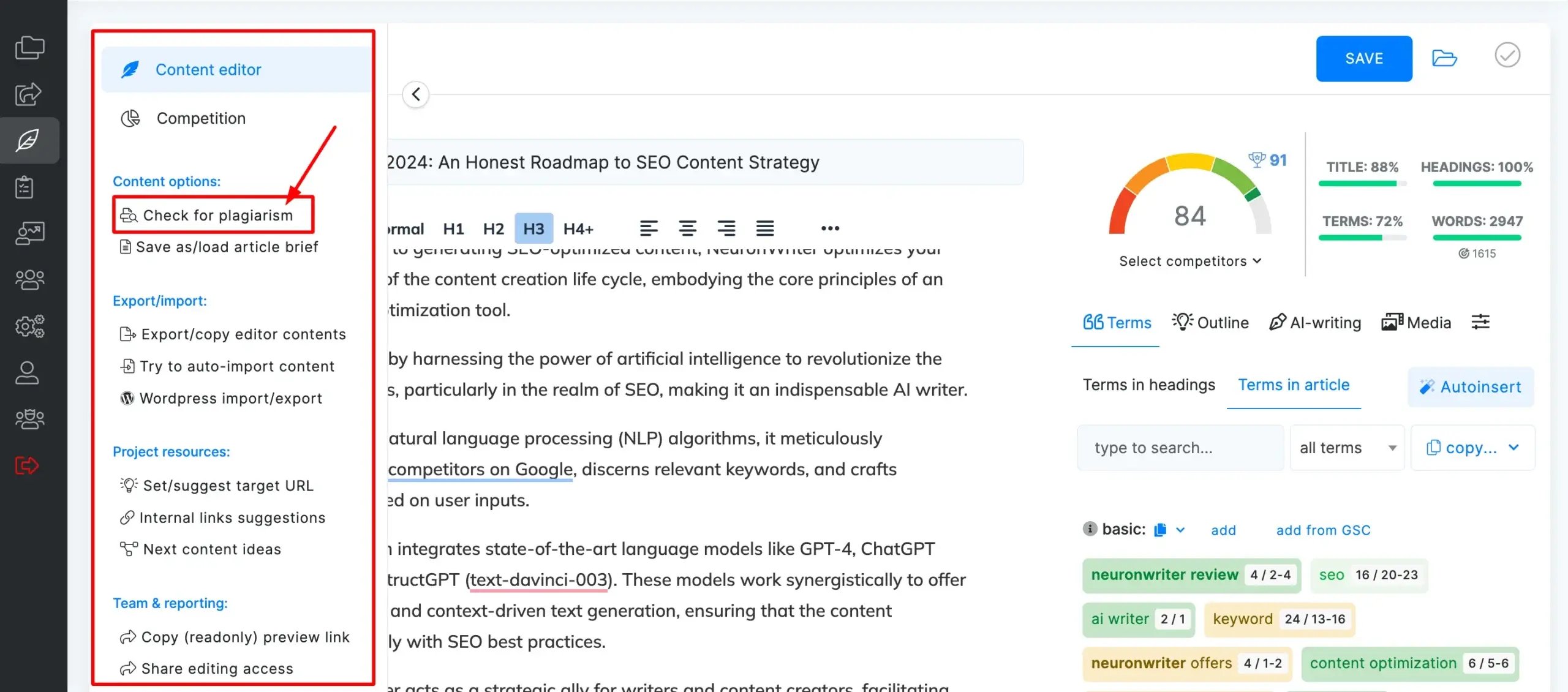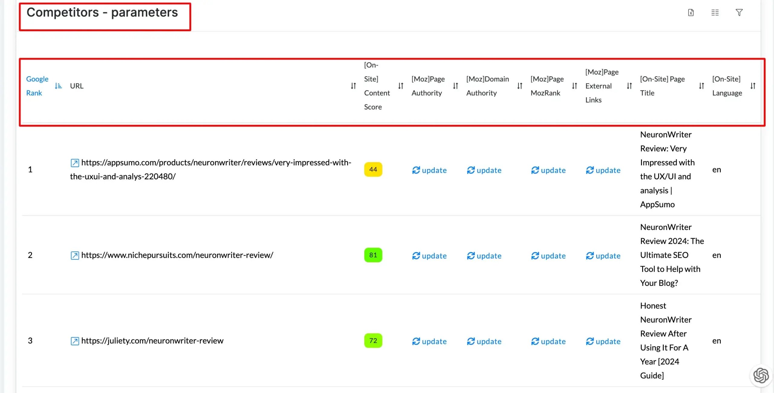 With this feature, you can perform SERP analysis and an in-depth survey of the top 30 ranked blogs on Google SERPs using Ahrefs and SEMRush SEO tools. This implies that NeuronWriter can also help you perform SEO analysis seamlessly.