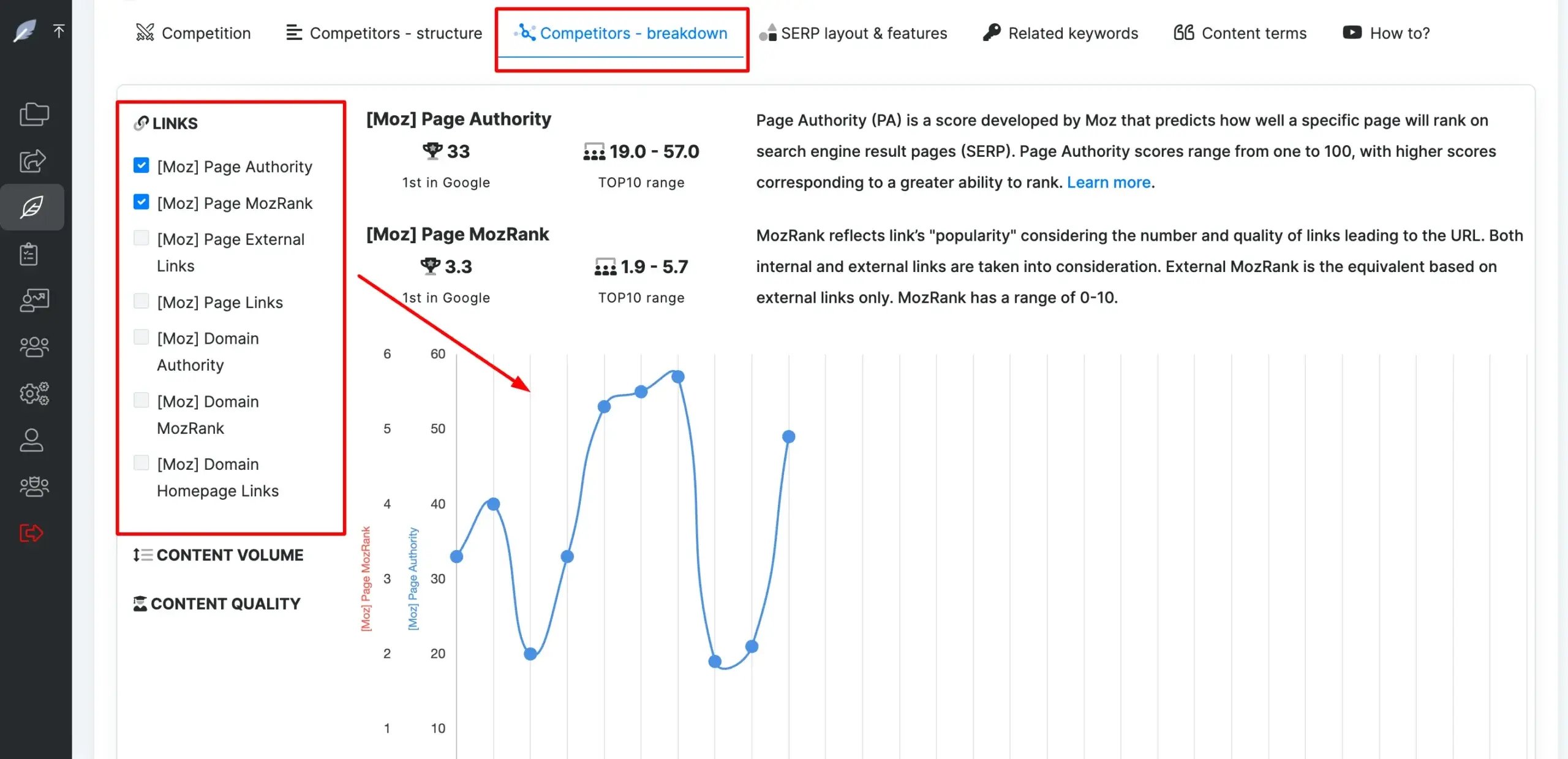 In the below image, you can see the competitors’ on-page and off-page parameters and scores.