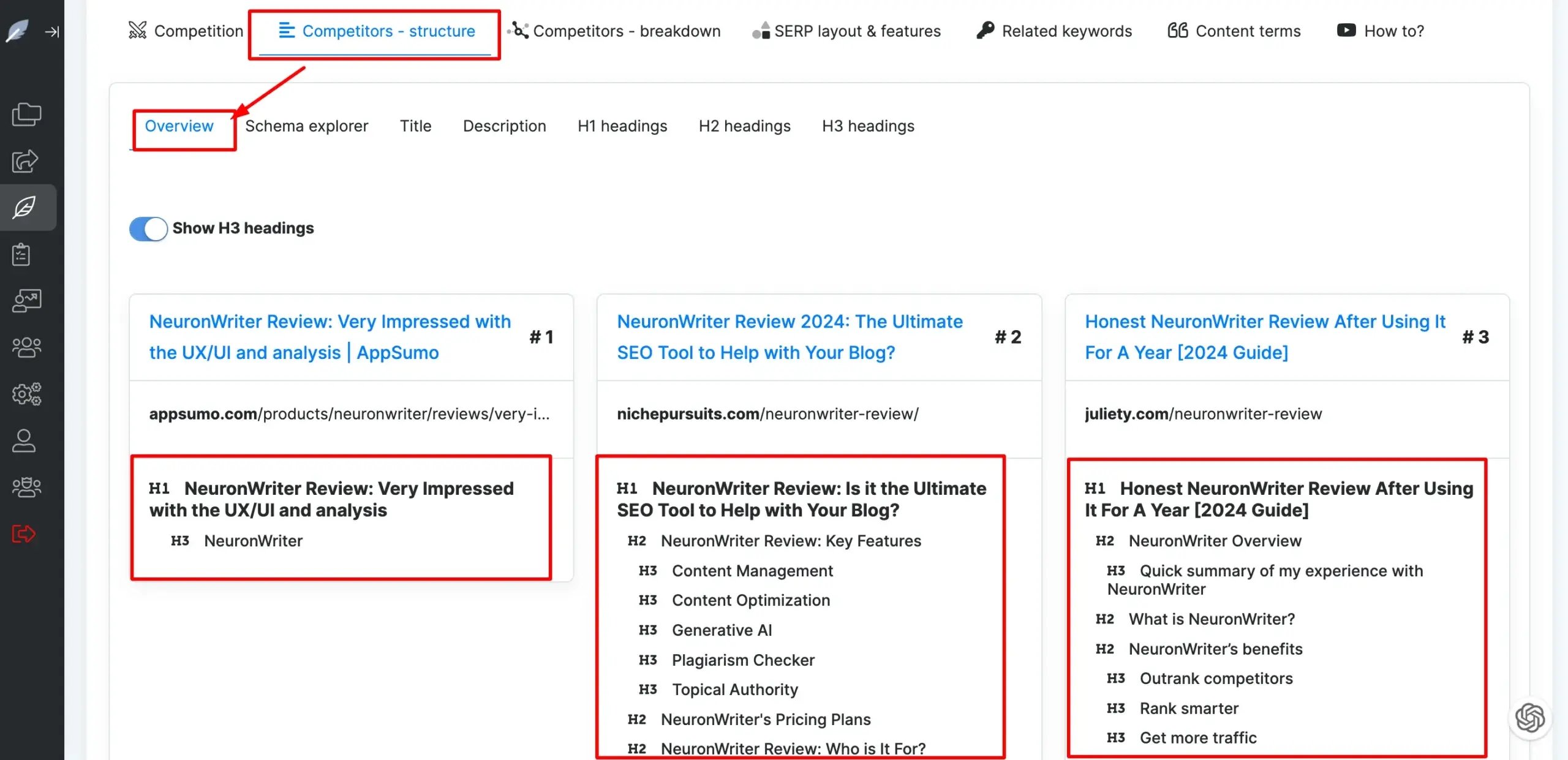 Under the competition structure, you can see your competitor’s blog outline. This will help you craft yours while understanding which headers to emphasize.