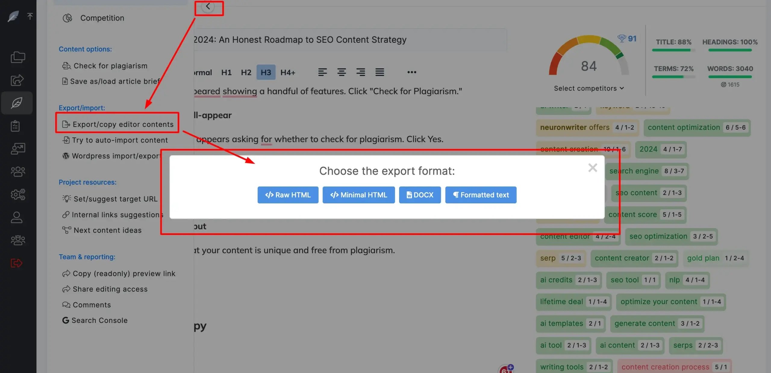 Did you know that NeuronWriter offers you an option to export your content seamlessly? Navigate to the options shown in the image below. You will see a popup window showing multiple export formats.