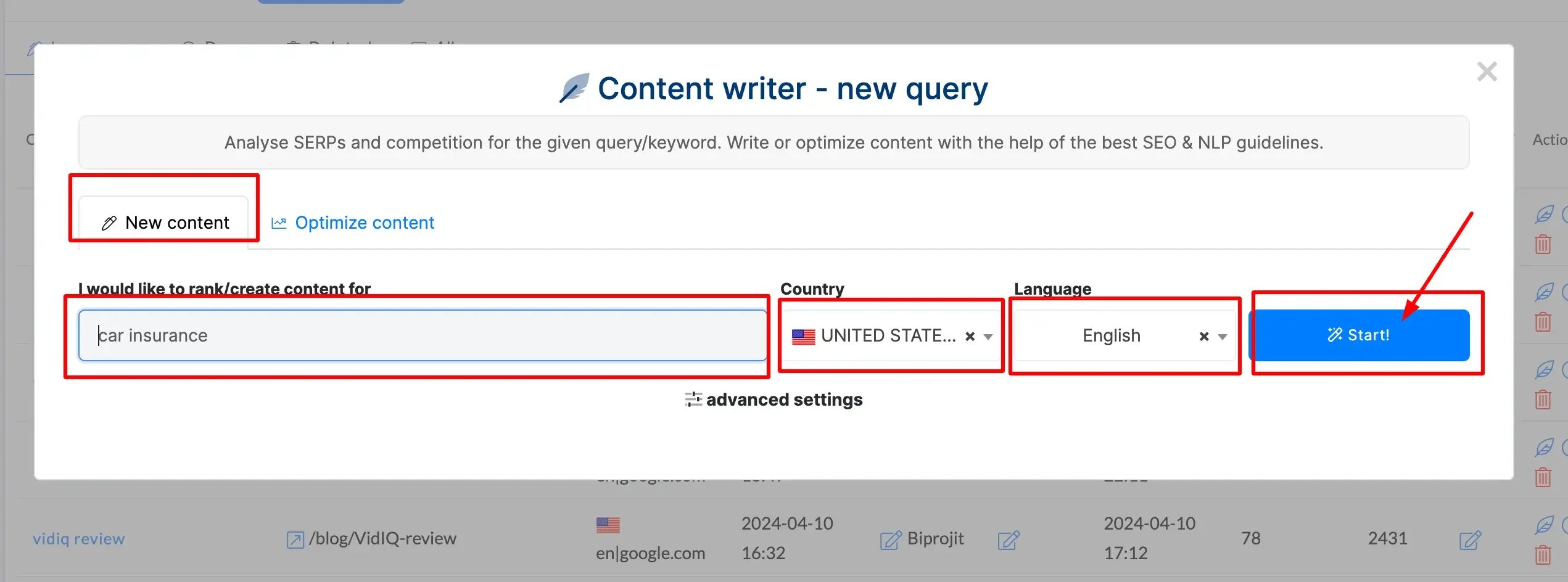 Fill your focus keyword in the longest bar, then add details to the other columns. Choose the language and target country.