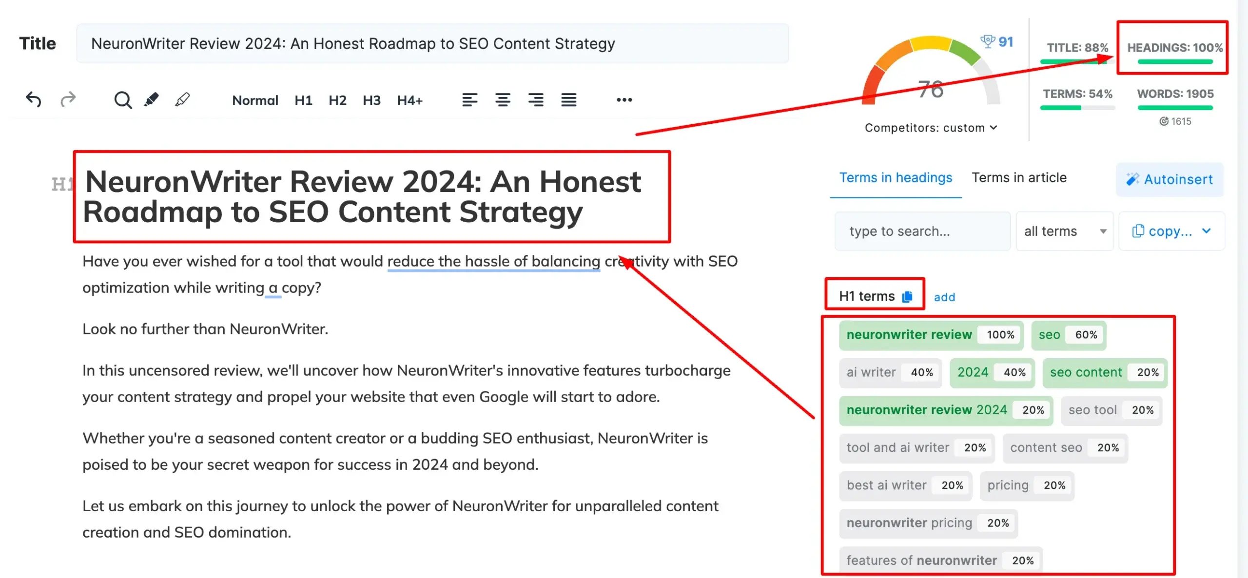 The next element, Heading, refers to the H1 of your blog. Its score will be improved by adding more terms from the “Terms in Heading” section, shown in the third part of the primary image.