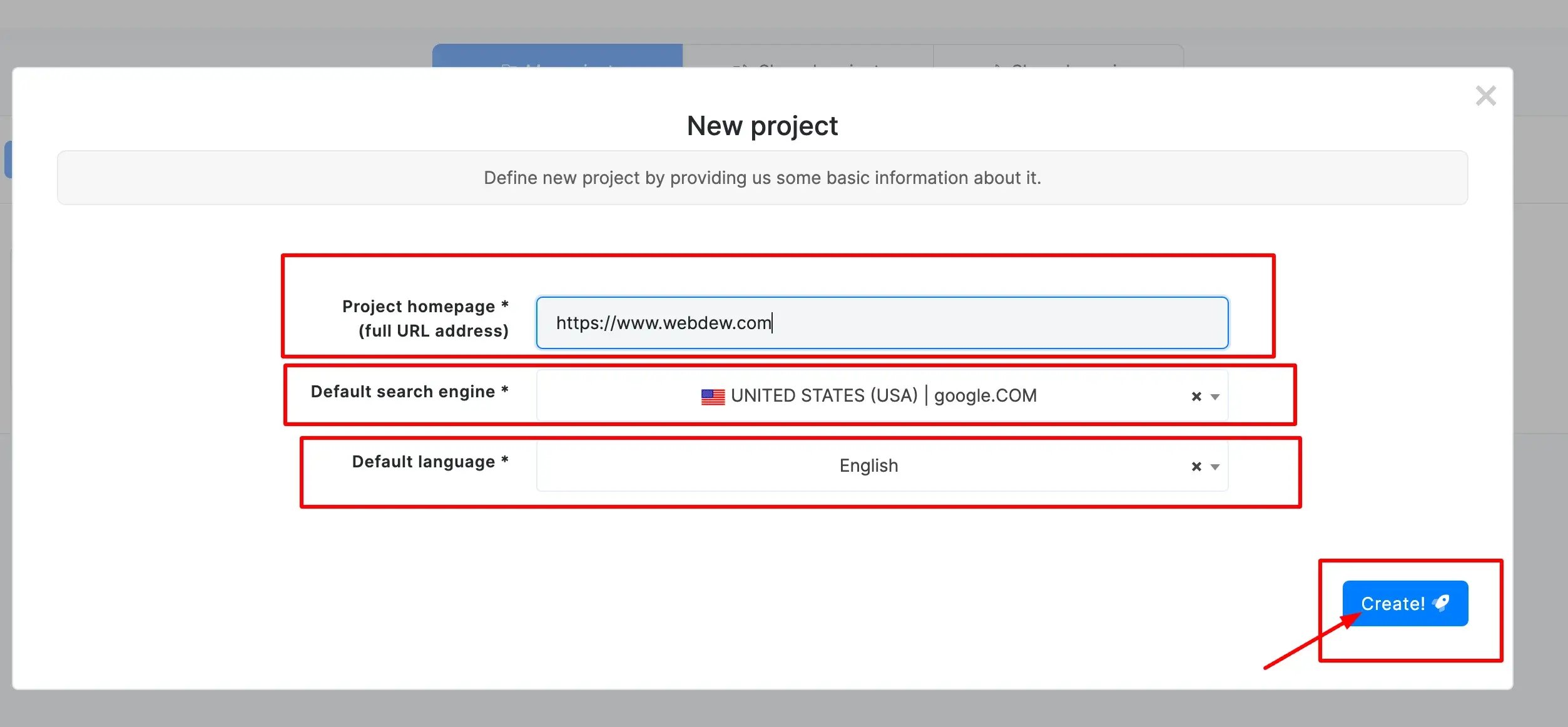Now, click the “Create” button after filling in all the details about the project homepage and default search engine & language.