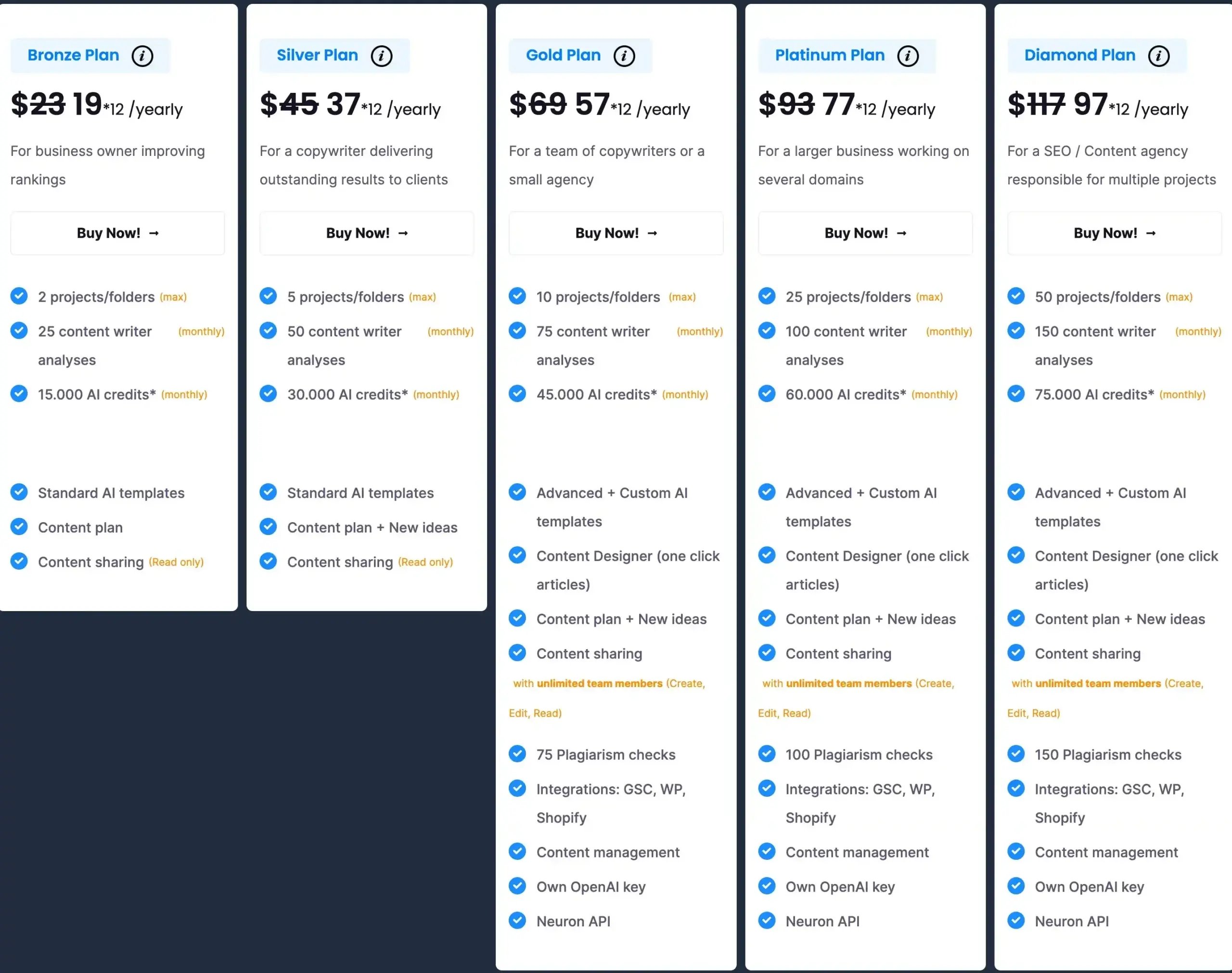 NeuronWriter provides five pricing plans. Each plan possesses unique features, along with the predecessor plan. Advanced features such as WordPress integration, Google Search Console integration, and content management are available from the Gold plan onwards.
