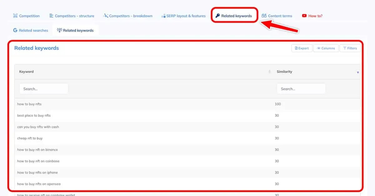 One standout aspect of Related Keywords is the similarity score provided with each keyword. This score helps you gauge the relevance of these keywords to your main topic and decide whether to include them in the same article or create a separate piece around them.