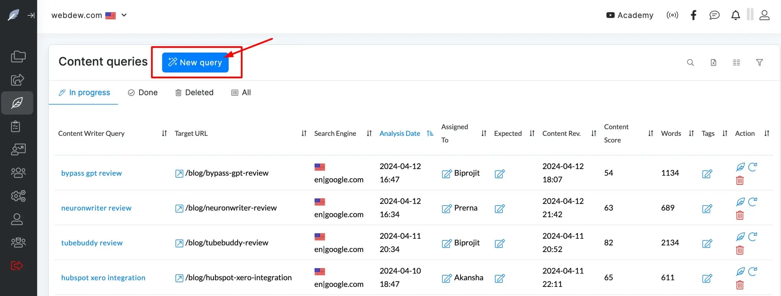 Click “New Query” to optimize your planned content for a specific focus keyword. In other words, you must give the NeuronWriter your focus keyword so that it can analyze and generate a list of competitors with similar focus keywords.