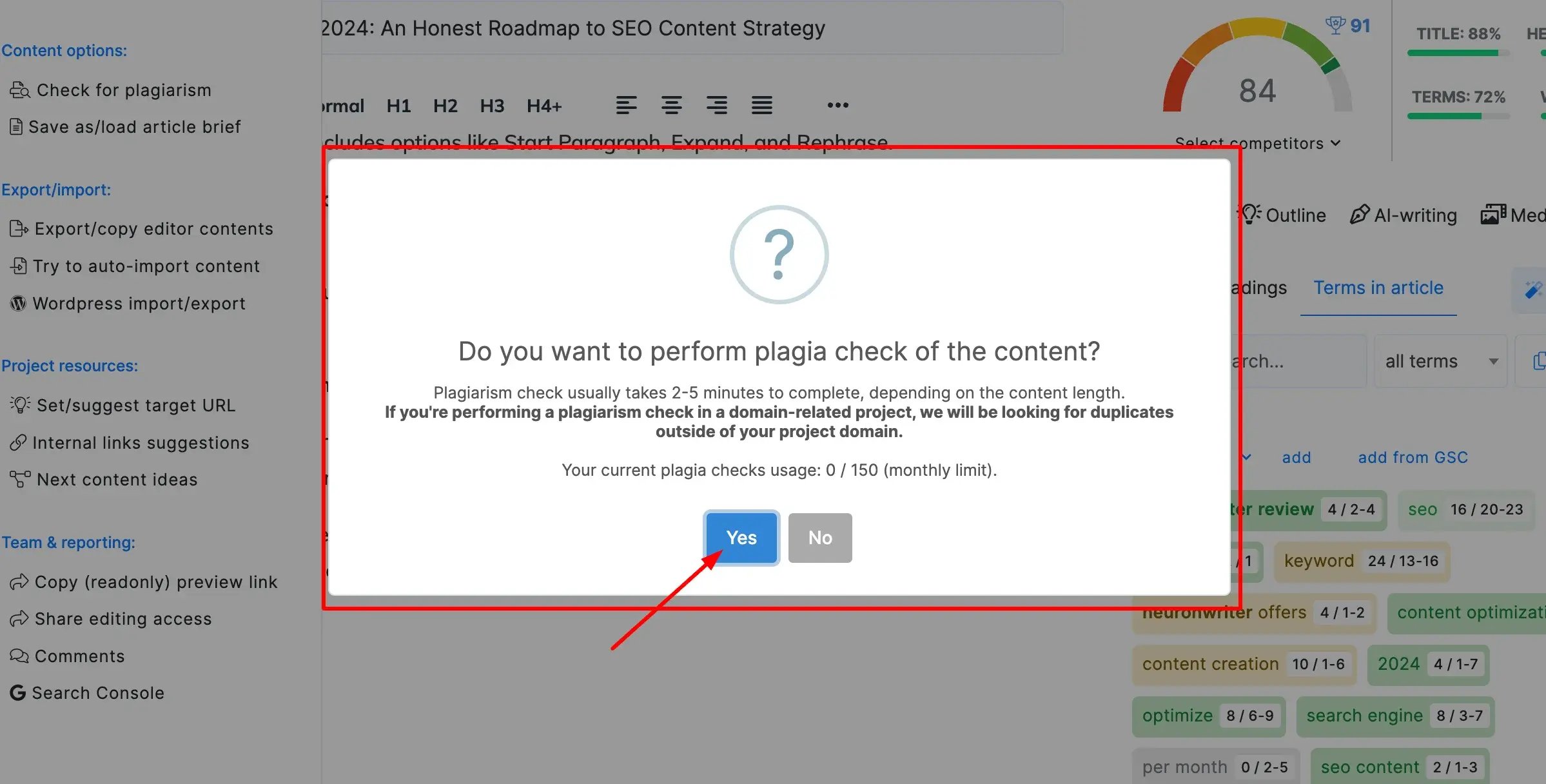 Now, a popup window appears asking whether to check for plagiarism. Click Yes.