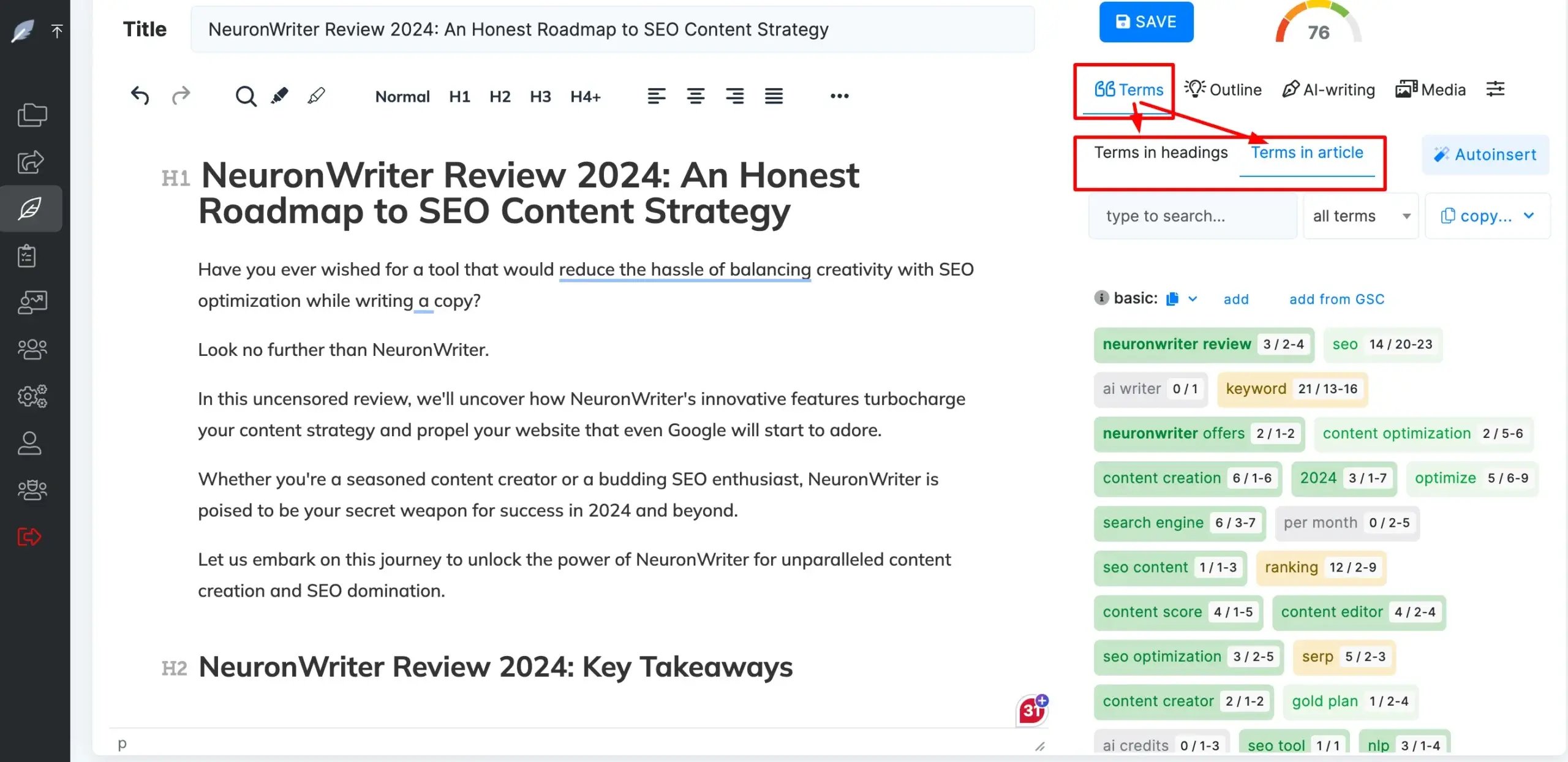 Scrolling down the “Terms in article” section, you will see two sections: Basic and Extended. These sections show the semantic keyword suggestions that go green once you’ve incorporated them into your content, helping you optimize your article for search engines and relevance.