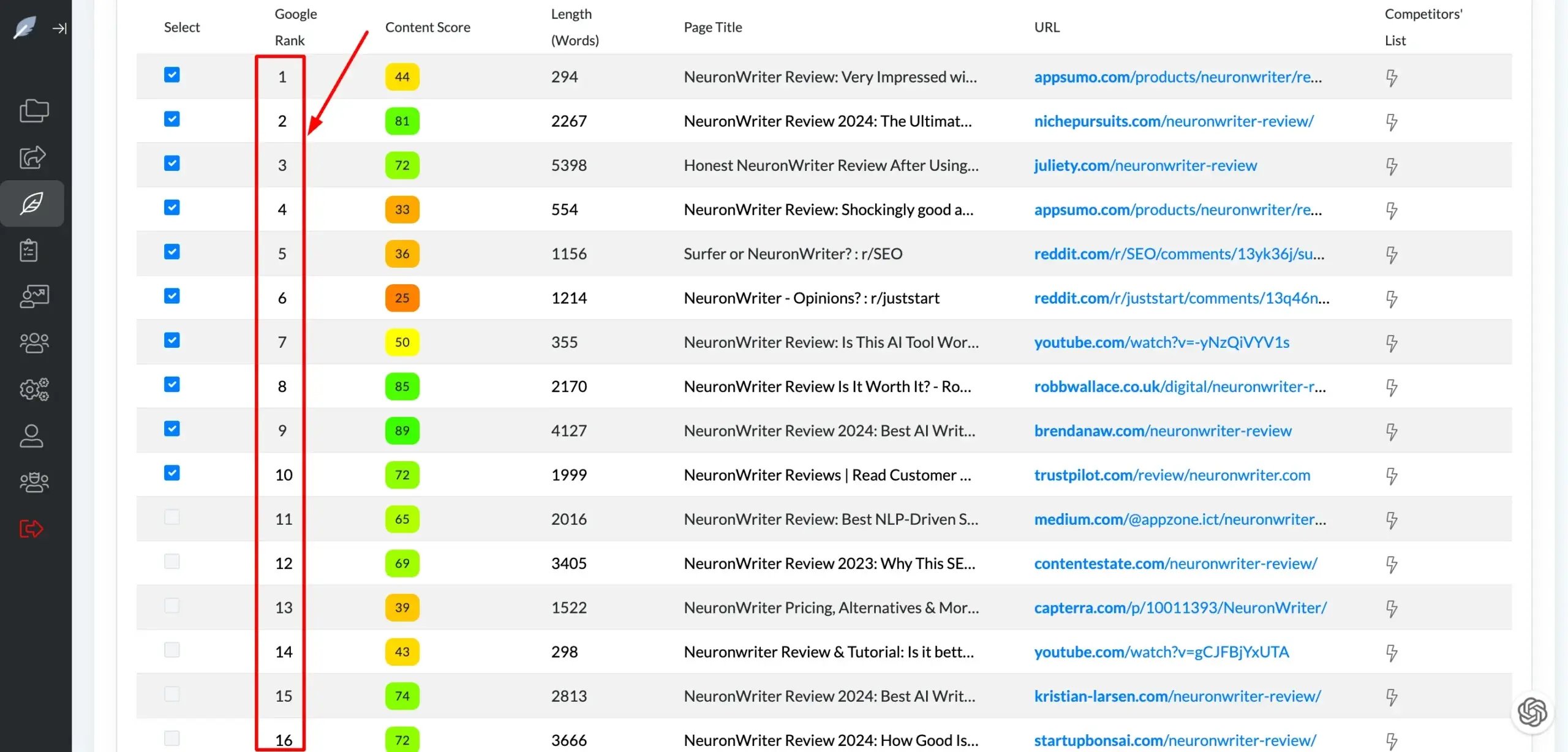Now, you have to optimize the results based on the search intent of the keyword you provided. In simple terms, uncheck the rows with a lower content score and those whose references are unsuitable for your blog post.