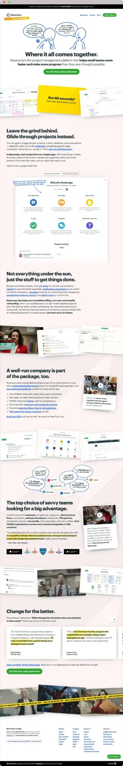 Basecamp was built with one purpose: to make things easy. These tools help keep track of work, show who’s doing what, save feedback and changes, bring all communication together so nothing is missed, and make sure important points are scheduled.