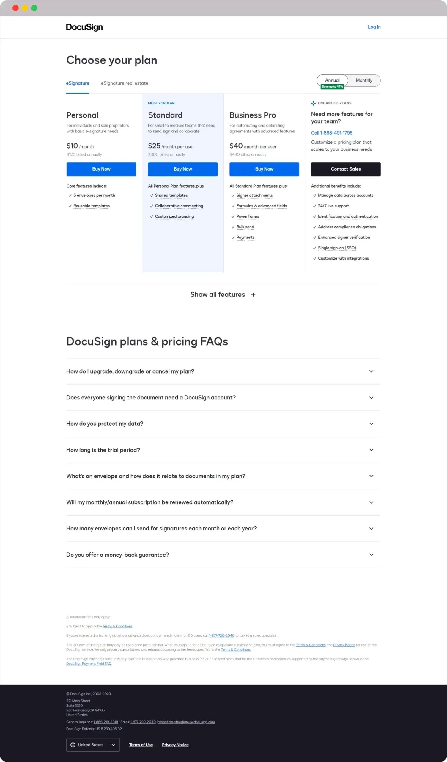 The page presents the pricing plans and features in a straightforward manner. As you near the end of the page, users are given the chance to locate answers to their questions in the FAQs section.